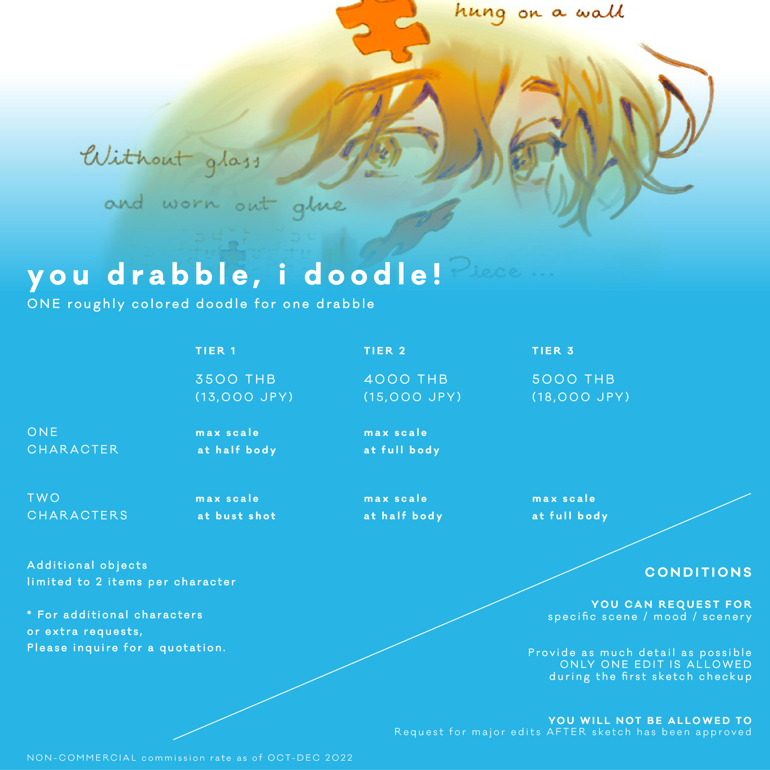 The Artist reserves the right to stop work on a Commission, or cancel a Commission request due to poor communication, rude/inappropriate behavior, an inability to effectively communicate in English / Thai / Japanese, or a breach of these Terms of Service. The Artist also reserves the right to stop or cancel work in the event of an emergency, accident, or illness.